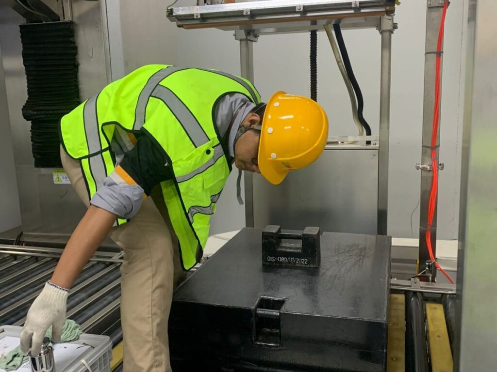 Kalibrasi weight checker di PT Huaneng New Material dilakukan langsung di lokasi (on-site calibration) oleh teknisi berpengalaman dari PT GIS. Metode ini memastikan hasil kalibrasi sesuai dengan kondisi aktual alat saat digunakan dalam proses produksi.